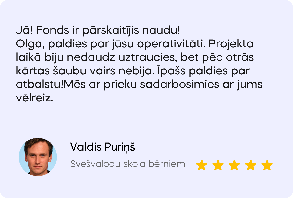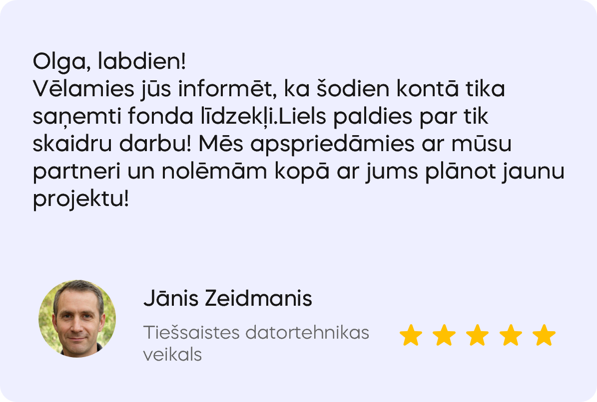 Ziņojums tiek iesniegts vienu reizi pirms finansējuma saņemšanas. Mēs to sagatavosim un iesniegsim kopā. Es jūs vadīšu no sākuma līdz pat izmaksas saņemšanai. ✅