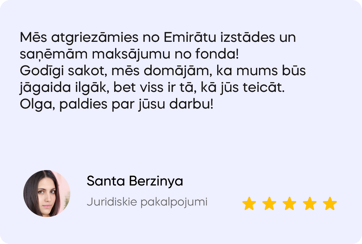Bezmaksas konsultāciju posmā mēs noskaidrojam, kādas ir iespējas saņemt samaksu, un neuzņemamies risināt situācijas, kurās pastāv jebkādi riski.